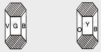 A cylinder is painted in six colours Green, Blue, Yellow, Violet, Red and Orange. Two positions are shown below: