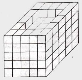 Directions : Questions (69-72), Some equal cubes are arranged in the form of a solid block as shown in the figure given below. All the visible surfaces of the block (except the bottom) are then coloured.