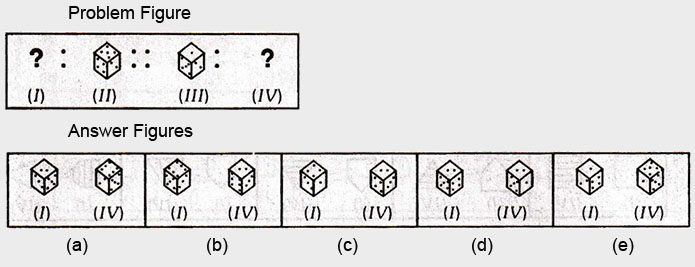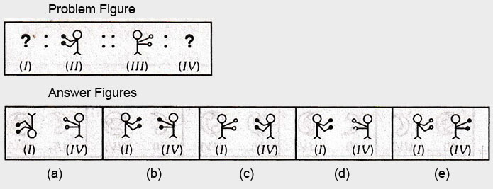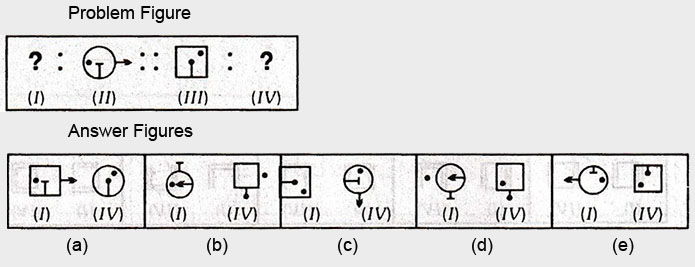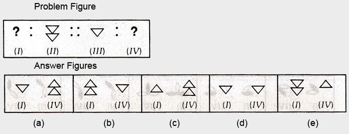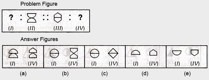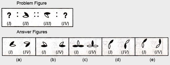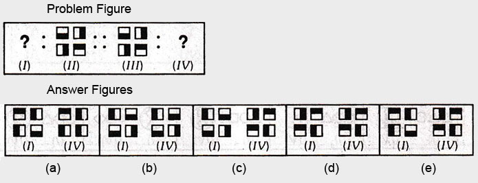 In each of the following questions, there are four figures marked (I), (II), (III) and (IV) which constitute the Problem set and figures marked (a), (b), (c), (d) and (e) each further consisting of two figures marked (I) and (IV) which constitute the Answer set. Select a figure from the answer set the contents of which best substitute the question marks in problem set such that fig. (III) is related to fig. (IV) in the same way as fig. (I) will be related to fig. (II).